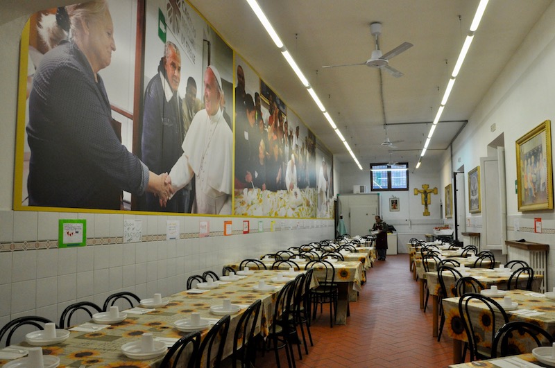 La chiamano ormai la «mensa del Papa», da quando Francesco vi fece tappa durante la sua visita pastorale a Firenze del 10 novembre 2015. Tutti i frequentatori hanno una tessera ricevuta al momento dell’iscrizione (gratuita) alla mensa, dove è necessario rilasciare le proprie generalità. Il resto fa parte della solidarietà e del bisogno di stare insieme. Si chiamano genericamente «i meno abbienti», ma di dignità e umiltà ne hanno da insegnare a tanti.