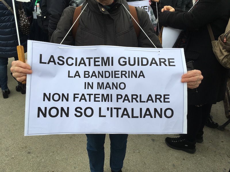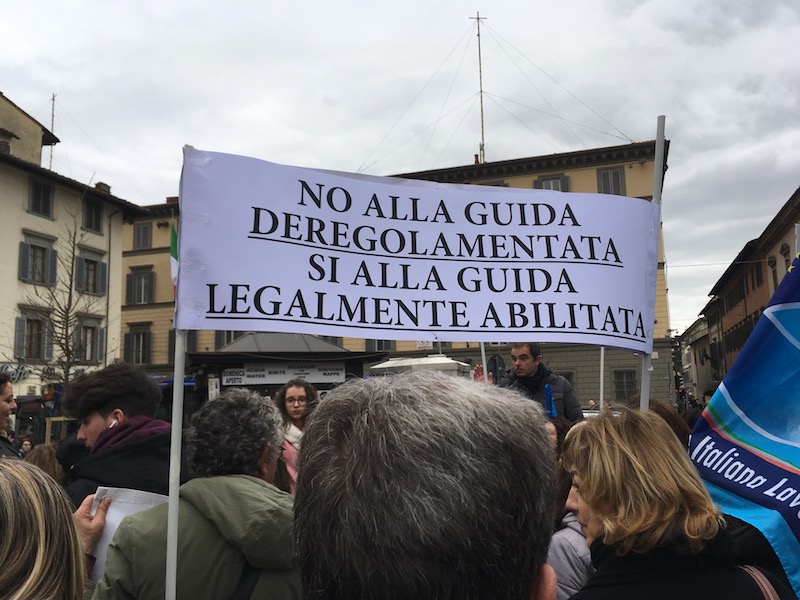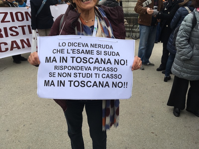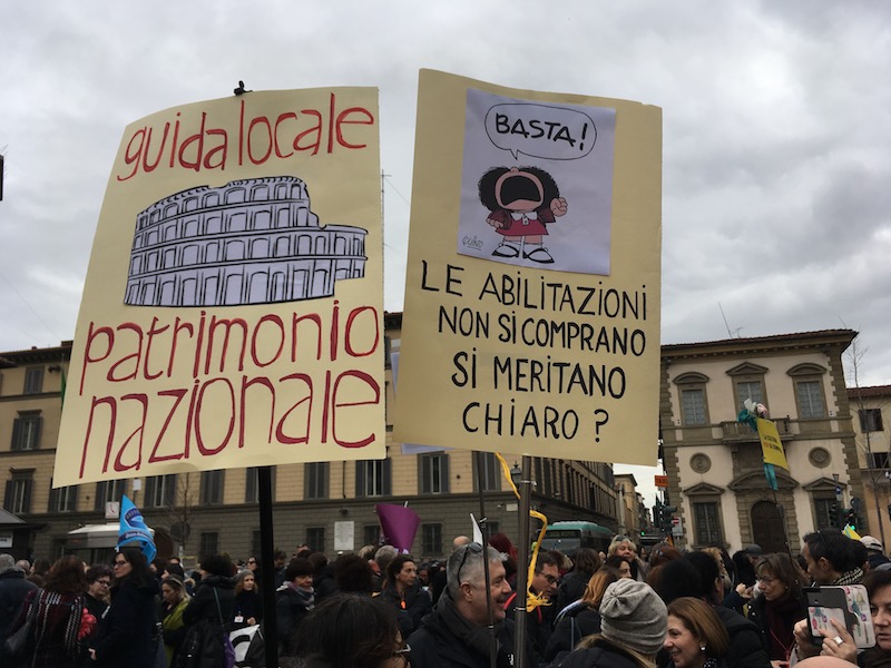 Nel mirino i corsi abilitativi, vigenti solo in Toscana e a pagamento, presso enti privati convenzionati con la Regione. Vi arrivano frequentatori da diverse parti d’Italia e dall’estero, che al termine conseguono l’abilitazione a guide turistiche in tutto il territorio nazionale. Guide che dunque possono accompagnare turisti indifferentemente alla Galleria degli Uffizi, al Colosseo, in Vaticano o al Teatro greco di Siracusa. «Senza che le competenze e le conoscenze del patrimonio culturale siano mai state verificate» si legge in un volantino dei partecipanti alla manifestazione di Firenze, che ricordano come centinaia di abilitazioni finiscano anche a soggetti stranieri che conoscono a stento l’italiano. «Solo esami pubblici seri e rigorosi possono abilitare professioni di qualità» è stato ripetuto più volte.