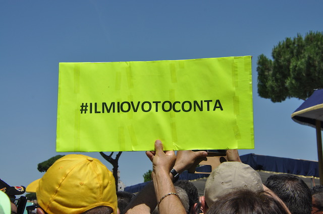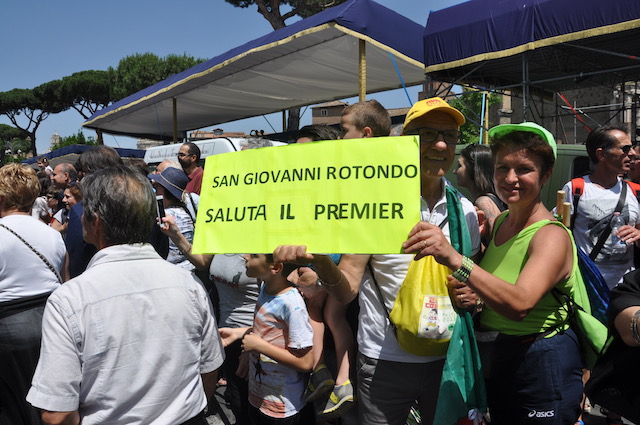 La folla (ben diversa da quella violenta del Manzoni nei Promessi Sposi) aumenta. «Forza presidente», «la Puglia è con te» sono le frasi più spesso ripetute. «Non fatemi i complimenti adesso – risponde il premier, che fino a pochi giorni prima è stato definito uno sconosciuto – non ho fatto ancora nulla. Spero che me li possiate fare dopo. Finora sono state fatte troppe chiacchiere, ora bisogna fare i fatti». «Tenete duro, teniamo duro» aggiunge dimenticando per un momento lo stile da professore universitario. C’è anche chi non dimentica di gridare «Ora dobbiamo vincere i mondiali» ma la frase non arriva a destinazione in mezzo a tanta folla. Svetta anche un cartello giallo «San Giovanni Rotondo saluta il premier». E sul retro un significativo: «#ilmiovotoconta».