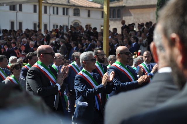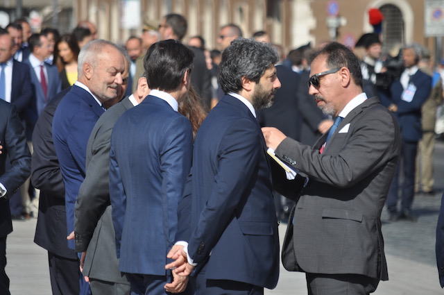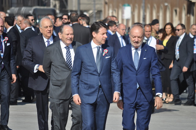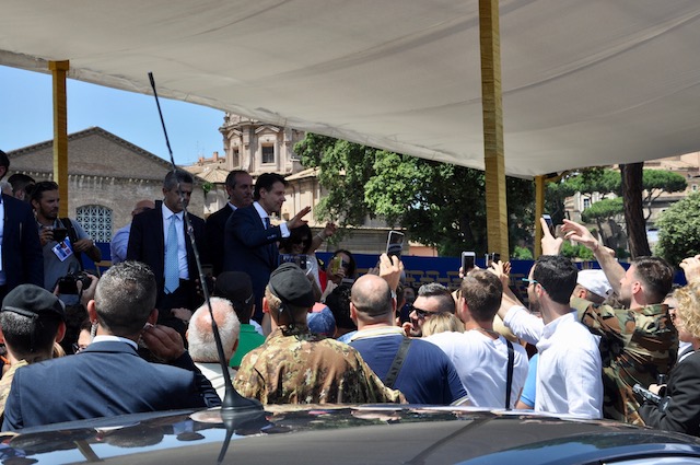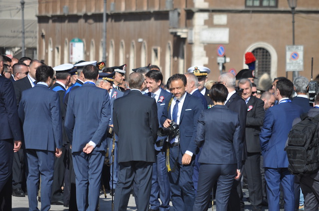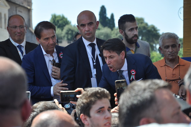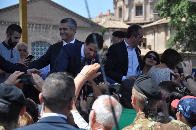 Al termine della parata militare, durata circa un’ora e mezzo, Conte si trattiene ancora un po’ sul palco presidenziale, quando già tutti gli altri Vip sono andati via. Circondato da alcuni sindaci, che hanno partecipato alla sfilata insieme a 400 colleghi di altrettanti comuni itaiiani, sembra sia un colloquio di pochi minuti. Molta gente intanto si assiepa sotto il palco reclamandolo a gran voce. Conte non si tira indietro e comincia a parlare con chi gli è davanti. Fotografie e selfie vanno a raffica, con gli uomini della sicurezza che – nonostante il sole estivo – cominciano a sudare freddo.