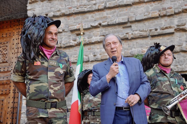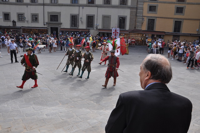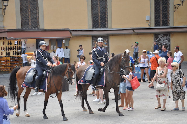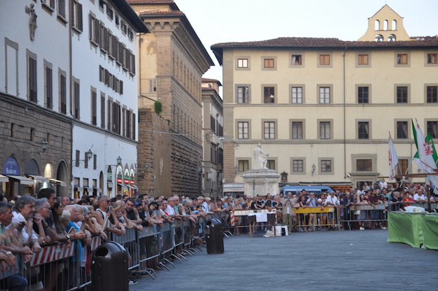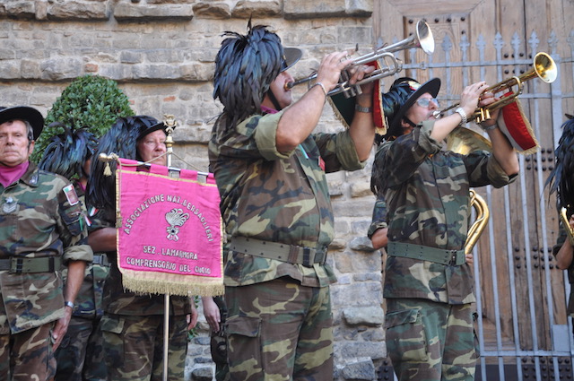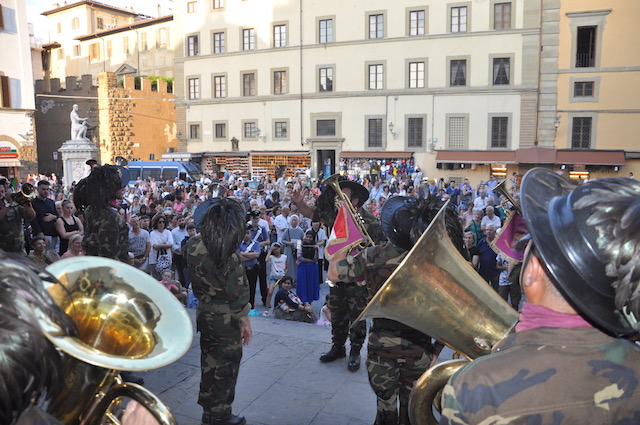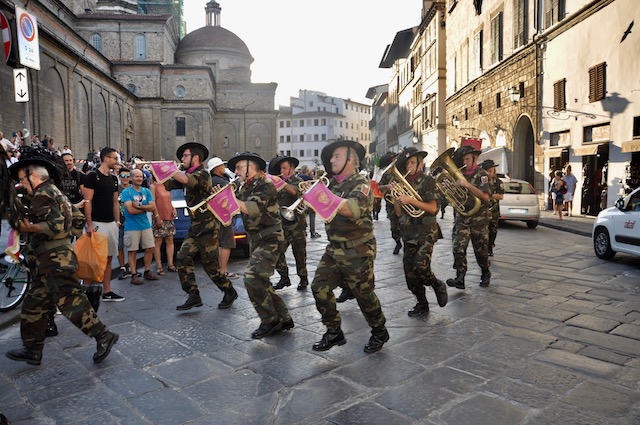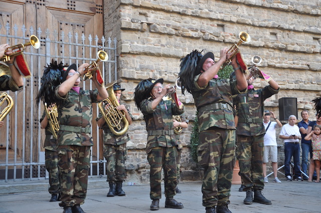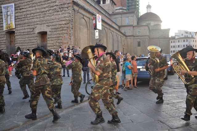 Grande festa in piazza San Lorenzo per la celebrazione del Santo. Dopo la messa solenne della mattina celebrata dal Cardinale arcivescovo Betori, nel pomeriggio di venerdì 10 agosto la piazza si è riempita di pubblico al suono delle trombe dei Bersaglieri. Intorno alle 19,30 si è esibita la Fanfara «La Marmora» di Montopoli Valdarno (che ha appena ‘compiuto’ 20 anni), con la partecipazione di membri delle fanfare di Firenze e di Prato. Guidata da Sergio Pasqualetti, i bersaglieri dopo essere rigorosamente arrivati di corsa (nonostante i quasi 40° gradi) si sono esibiti sul sagrato della Basilica, presentati al pubblico dal presidente dell’Opera Medicea Laurenziana Paolo Padoin, già prefetto di Firenze ma anche di Pisa, dove aveva conosciuto e apprezzato l’attività della fanfara di Montopoli Valdarno. Fiorentini e turisti si sono stretti intorno ai bersaglieri con smarthpone e videocamere sempre accesi per non perdere nessuna delle esibizioni dei fanti piumati.