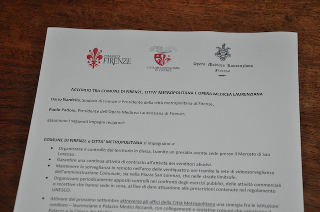 Proprio su iniziativa del prefetto Padoin è stata oggi firmato un accordo tra Comune, Città Metropolitana e Opera Laurenziana per garantire – si legge in una nota di Palazzo Vecchio – una maggiore sicurezza del complesso di San Lorenzo e dell’area circostante». Tra i punti principali, sottoscritti da Nardella e Padoin alla presenza del prefetto Lega: