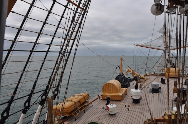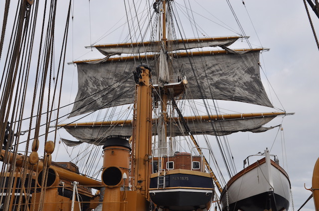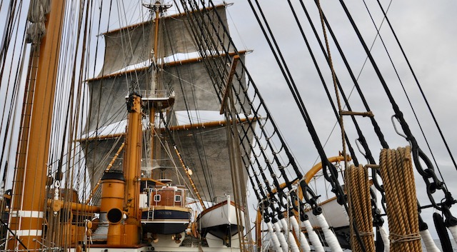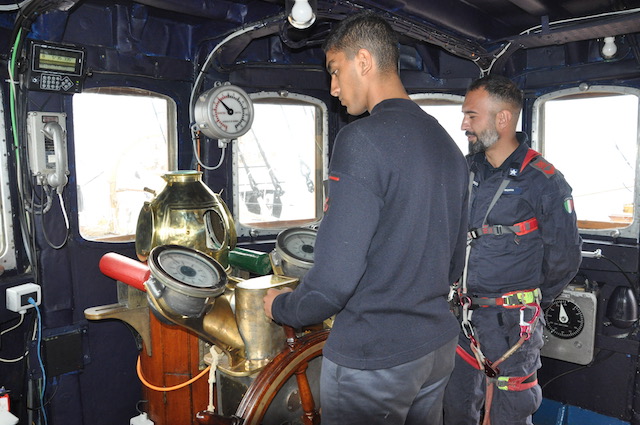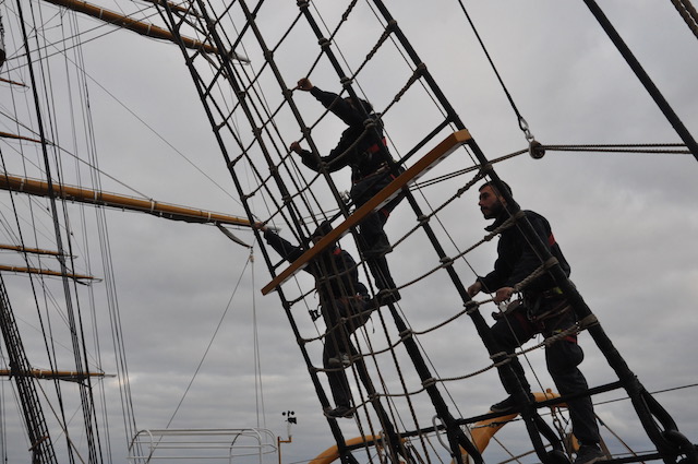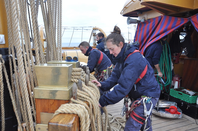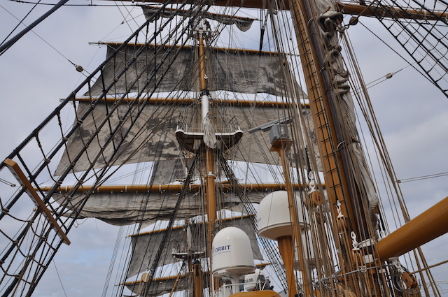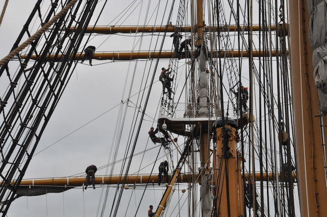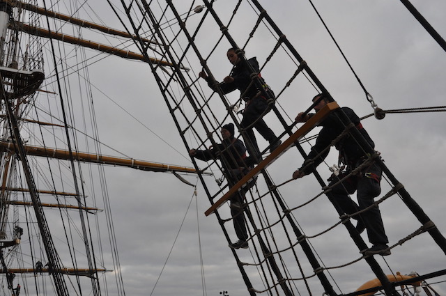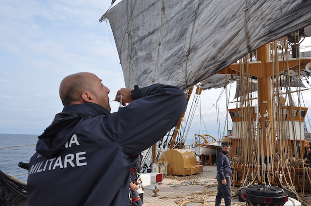 Quando il vento comincia ad essere favorevole viene pianificata l’apertura delle vele. Ed ecco che (tutti o in parte) i 2650 metri quadri delle vele vengono giù, dopo che la squadra di turno dei nocchieri è salita a riva per scioglierle dai pennoni. Sui ponti della nave un’altra squadra, tra cui allievi di Accademia che così fanno davvero pratica marinaresca, è pronta a tirare e bloccare le cime delle vele (in tutto ce ne sono ben 36 chilometri) ai rispettivi bozzelli di legno. Tutto a mano, in una nave dove non c’è una macchina meccanica per le manovre tranne che per le ancore. Tradizione e attività marinaresca vuol dire anche questo.