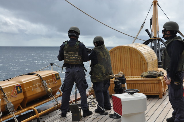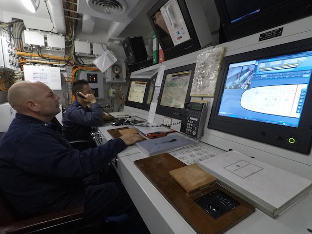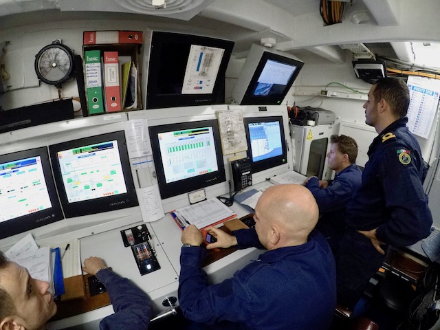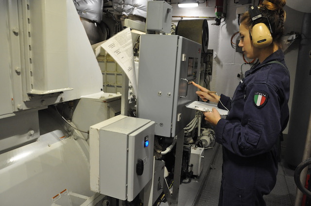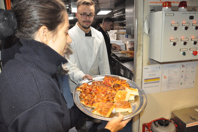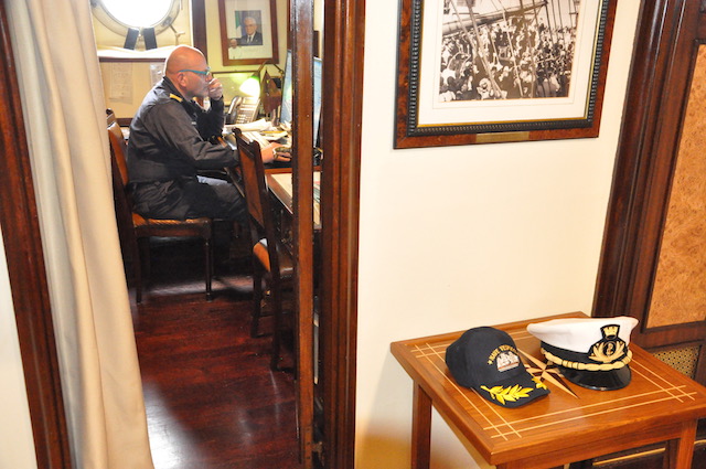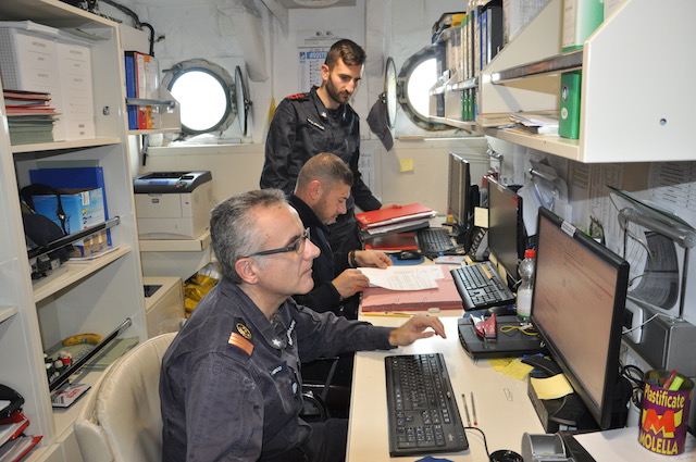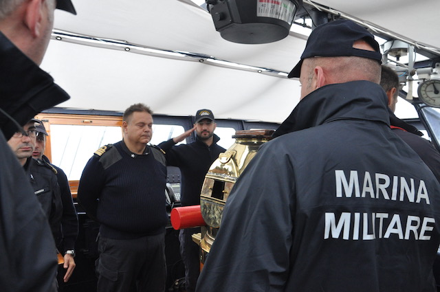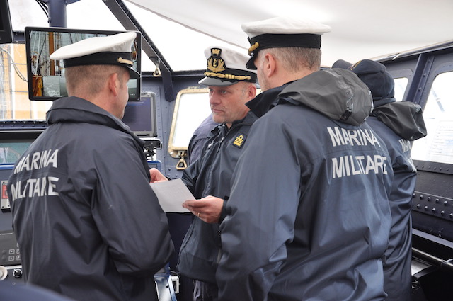 Alle 8,15 il comandante Roberto Recchia (che lascerà il comando il 4 ottobre a Brindisi al suo pari grado, capitano di vascello Stefano Costantino) riunisce i suoi ufficiali in plancia per la prima riunione della giornata. Ciascuno riferisce la situazione del proprio reparto (rotta, meteo, reparto marinaresco, commissario di bordo, direttore di macchina, medico di bordo) e vengono prese le decisioni del caso. Poi ognuno alla propria «batteria».