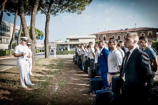 Sono stati accolti dai loro inquadratori, ufficiali Guardiamarina del 5° anno. Primo ingresso in dormitorio per lasciare il bagaglio e ritirare la divisa. Quindi l’incontro, già schierati, con il Comandante alla classe che dà loro il benvenuto.