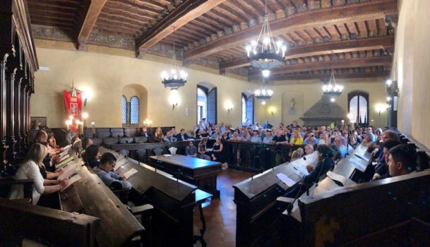 La seduta inaugurale del consiglio comunale 2019-2024, presieduto da Nicola Carini, si conclude con gli inni d’Italia e d’Europa. Non prima che il sindaco Meoni abbia raccomandato al gran numero di cittadini che gremiscono la sala consiliare: «Venite sempre al Consiglio comunale, è un diritto di tutti».