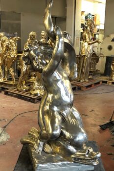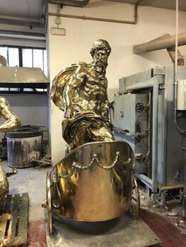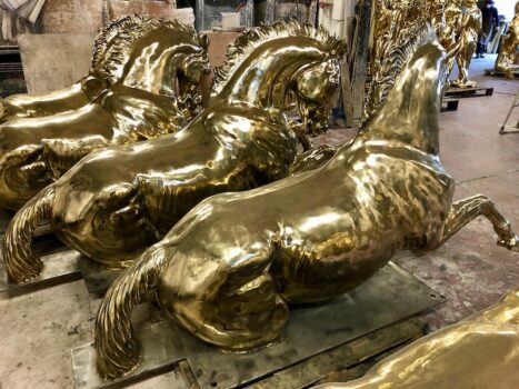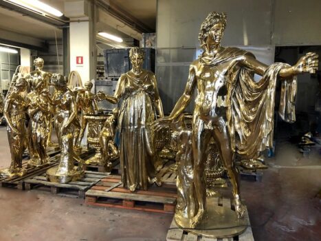 Le statue fanno parte di un ordine di circa 60 pezzi artistici arrivato dal Vietnam alla Galleria Frilli e portato a termine nonostante le difficoltà dovute alla pandemia Covid19 a livello mondiale. Tra le varie realizzazioni spiccano anche cinque impetuosi cavalli destinati idealmente a trainare il carro dove, imponente, c’è un personaggio ispirato alla statuaria classica. In tutto sono oltre 10 le tonnellate di bronzo giallo, il più resistente alle intemperie e alla salsedine marina, pronte ad affrontare un lungo viaggio verso l’estremo Oriente dove sono attese entro il prossimo dicembre 2020.