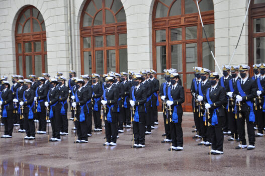 Agli ordini del Comandante alla classe, il capitano di corvetta Mariano Tortoriello, 135 neo allievi ufficiali della 1ª classe dei corsi normali sono rimasti immobili nel piazzale in attesa del giuramento, al quale in cuor loro non volevano rinunciare per nessun motivo. Qualunque fossero le condizioni meteo. Con loro 7 neo allievi ufficiali piloti di complemento guidati dal capitano di fregata Alessandro Bausone. Schierati anche tutti gli allievi più «anziani» degli altri corsi. In tutto oltre 300 persone agli ordini del neo Direttore dei Corsi dell’Accademia, capitano di fregata Alessandro Trivisonne, insediato da poco più di un mese nell’incarico.