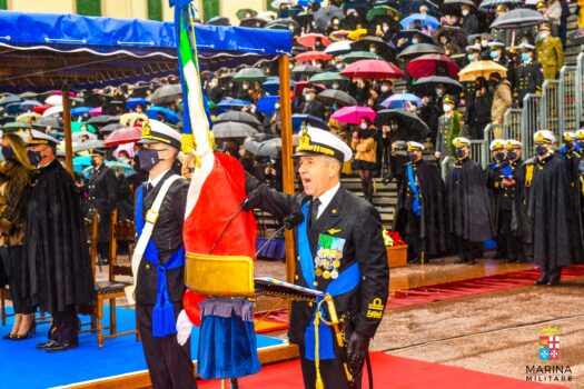 A riceverli il comandante dell’Accademia Navale, ammiraglio di divisione Flavio Biaggi. A lui il compito, come tradizione, di rivolgere il primo saluto ai «suoi» allievi. Dopo aver sottolineato che quest’anno è il 140° anniversario dell’Istituto inaugurato il 6 novembre 1881, Biaggi ha tra l’altro ringraziato le famiglie degli allievi per aver loro «saputo trasmettere integrità morale, spirito di sacrificio, senso del dovere, amor di Patria, imprescindibili per chi decide di intraprendere la carriera militare». All’ammiraglio Biaggi il compito di pronunciare la formula del giuramento, urlata quindi in coro da 142 voci riecheggiate anche ben oltre il piazzale dell’Accademia.