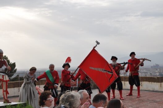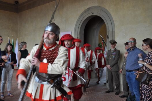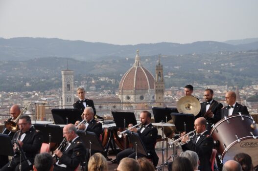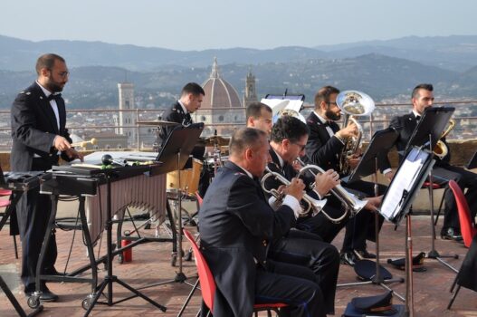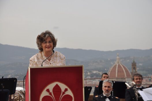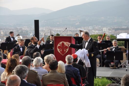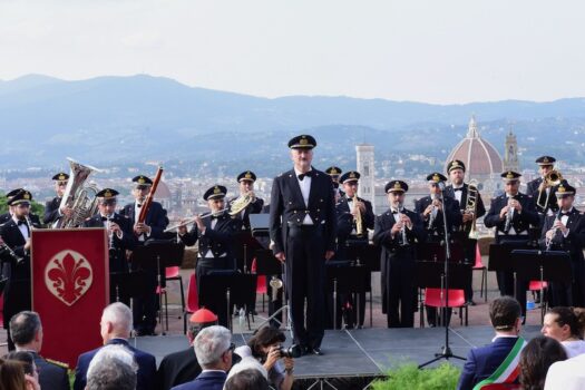 Suggestiva la cerimonia che è tornata a svolgersi giovedì 23 giugno sulla terrazza del Forte di Belvedere, alla vigilia della festa del patrono San Giovanni del 24, davanti a tutti i monumenti fiorentini a fare da cornice. Molto applaudita l’esecuzione di alcuni brani da parte della Banda musicale dell’Aeronautica militare diretta dal Maestro Vice Direttore, maggiore Marco Moroni. Presenti il Gonfalone della Città di Firenze, il Gruppo Balestrieri e Madonne del Calcio storico fiorentino, l’Arciconfraternita di Parte Guelfa.