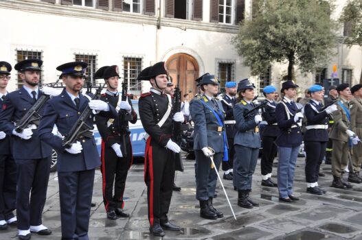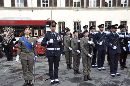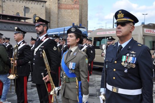 Nella piazza, con le massime autorità civili e militari cittadine, era schierato un reparto di formazione composto da rappresentanze di Esercito, Carabinieri, Aeronautica, Polizia di Stato, Guardia di Finanza, Polizia Penitenziaria, Corpo Militare e Infermiere Volontarie della CRI, Vigili del Fuoco. Presenti le rappresentanze delle Associazioni d’Arma e dell’Istituto nazionale del Nastro Azzurro. Gli onori militari sono stati resi dalla Fanfara della Scuola Marescialli e Brigadieri dei Carabinieri.