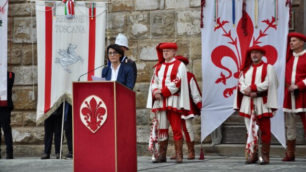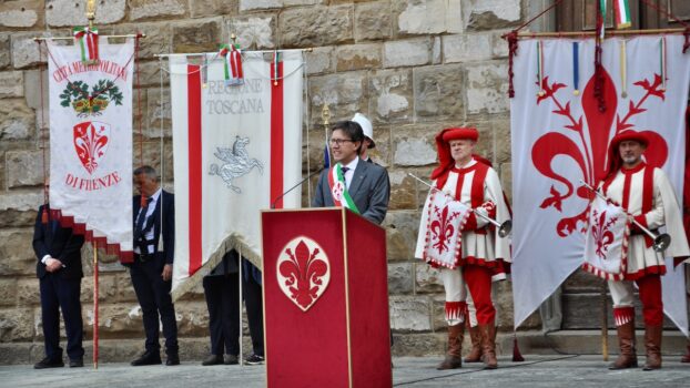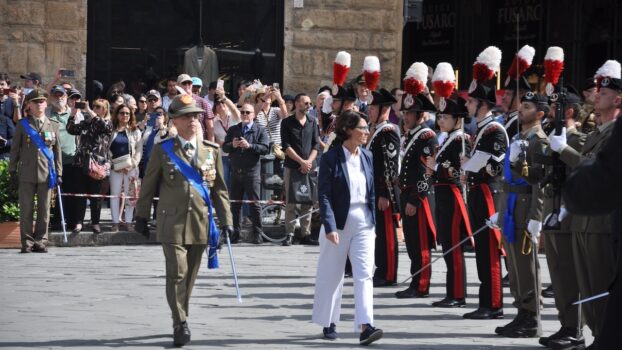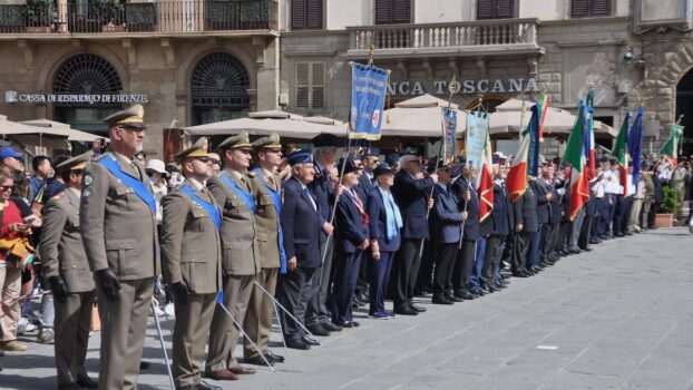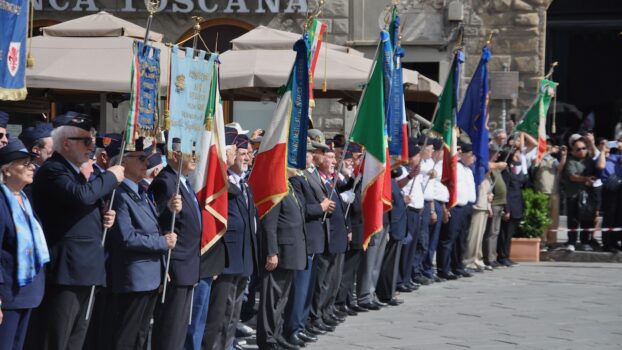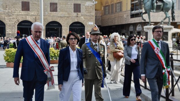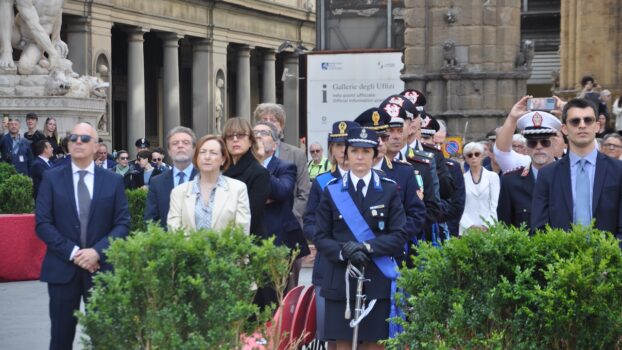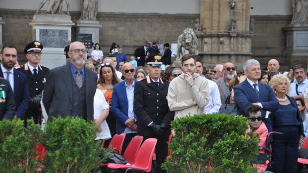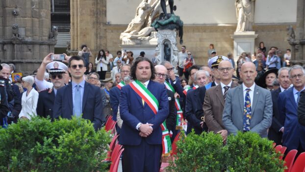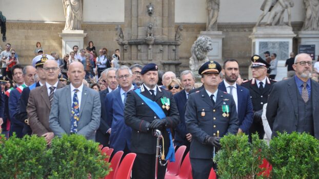 Nella cornice di piazza della Signoria la cerimonia è iniziata con un solenne alzabandiera ai piedi della storica Fontana del Nettuno. Accolta dal presidente della Regione Eugenio Giani e dal sindaco di Firenze Dario Nardella, il prefetto Francesca Ferrandino, accompagnata dal comandante del presidio militare generale di corpo d’armata Massimo Panizzi, ha passato in rassegna un reparto di formazione interforze con la fanfara della Scuola Marescialli e Brigadieri dei Carabinieri. Schierate anche le rappresentanze dell’Istituto Nazionale del Nastro Azzurro e di numerose associazioni d’Arma. Ai piedi dell’Arengario di Palazzo Vecchio erano presenti le massime autorità civili, militari e religiose di Firenze.