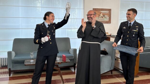 Dopo la cerimonia, un simpatico momento conviviale si è svolto con la «Calotta» dei giovani ufficiali (sottotenenti e tenenti) dell’Isma. È tradizione dell’inaugurazione dell’anno in Accademia Aeronautica tagliare un lembo della cravatta degli ospiti d’onore. Con il francescano padre Benanti la cosa sarebbe stata più complessa. Ma la tenente Gabriella Cesareo, capo calotta, non si è arresa. Tra gli applausi dei presenti e la piena disponibilità dell’interessato, si è armata di un robusto paio di forbici con cui ha tagliato buona parte del «cingolo» del saio del frate. Al quale, dopo le foto di rito, è stato prontamente regalato un nuovo cordone. Viaggiare in treno per rientrare a Roma, con un cordone «mutilato» non sarebbe stato opportuno. Il grido storico «GhereGheGhez» con i calici alzati di tutti i presenti ha quindi sancito la fine dell’evento.
